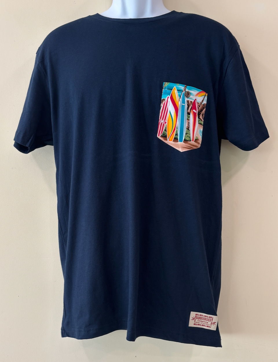 Surfboards and rainbows on a navy tee