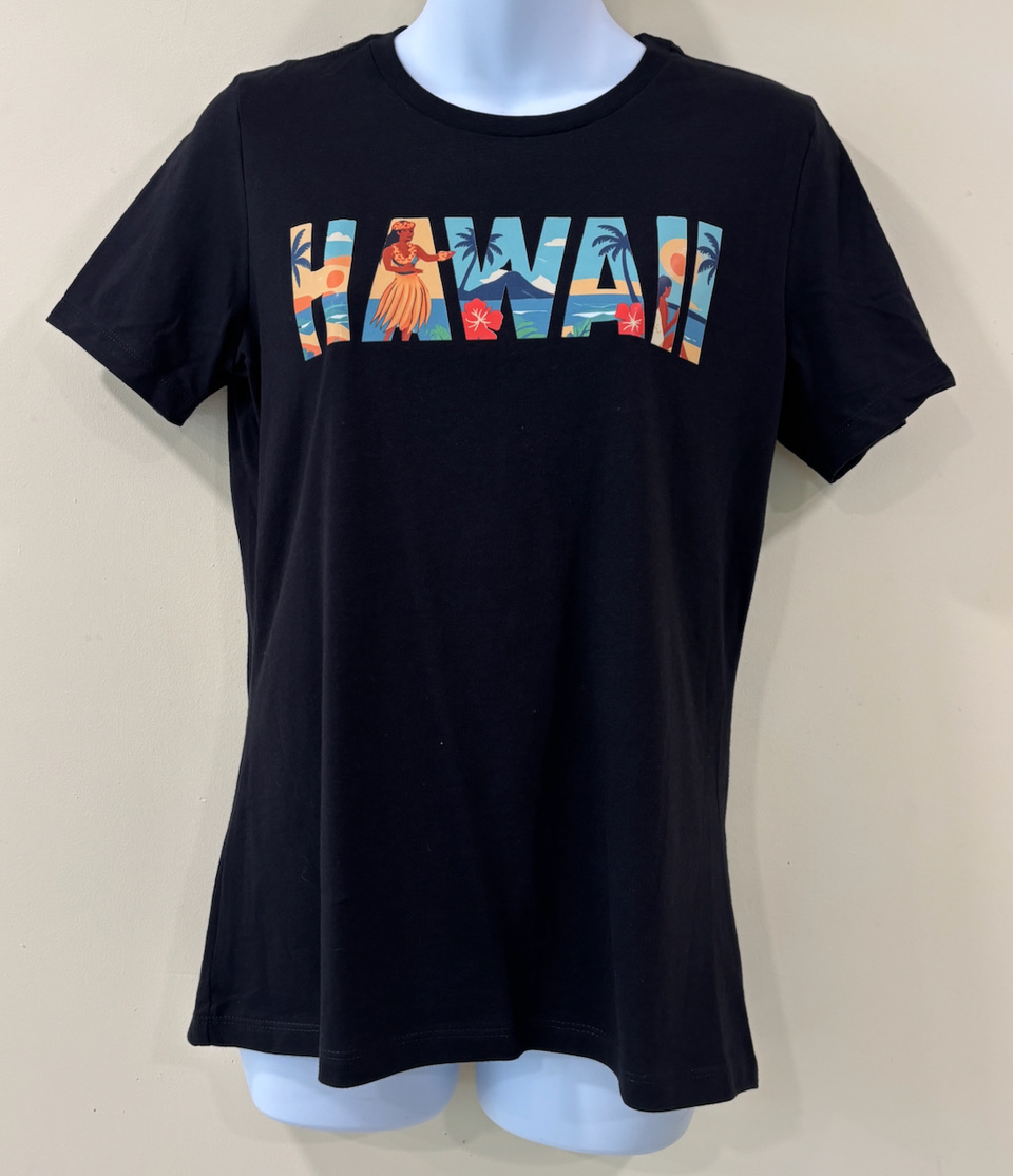 Cut out letters spelling Hawai’i with a hula girl and palm trees