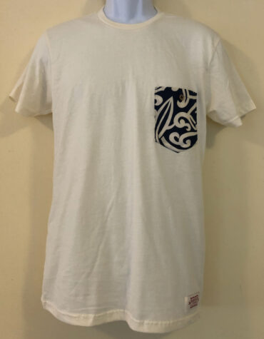 Pineapples and banana leaves are on a navy background on a navy tee.